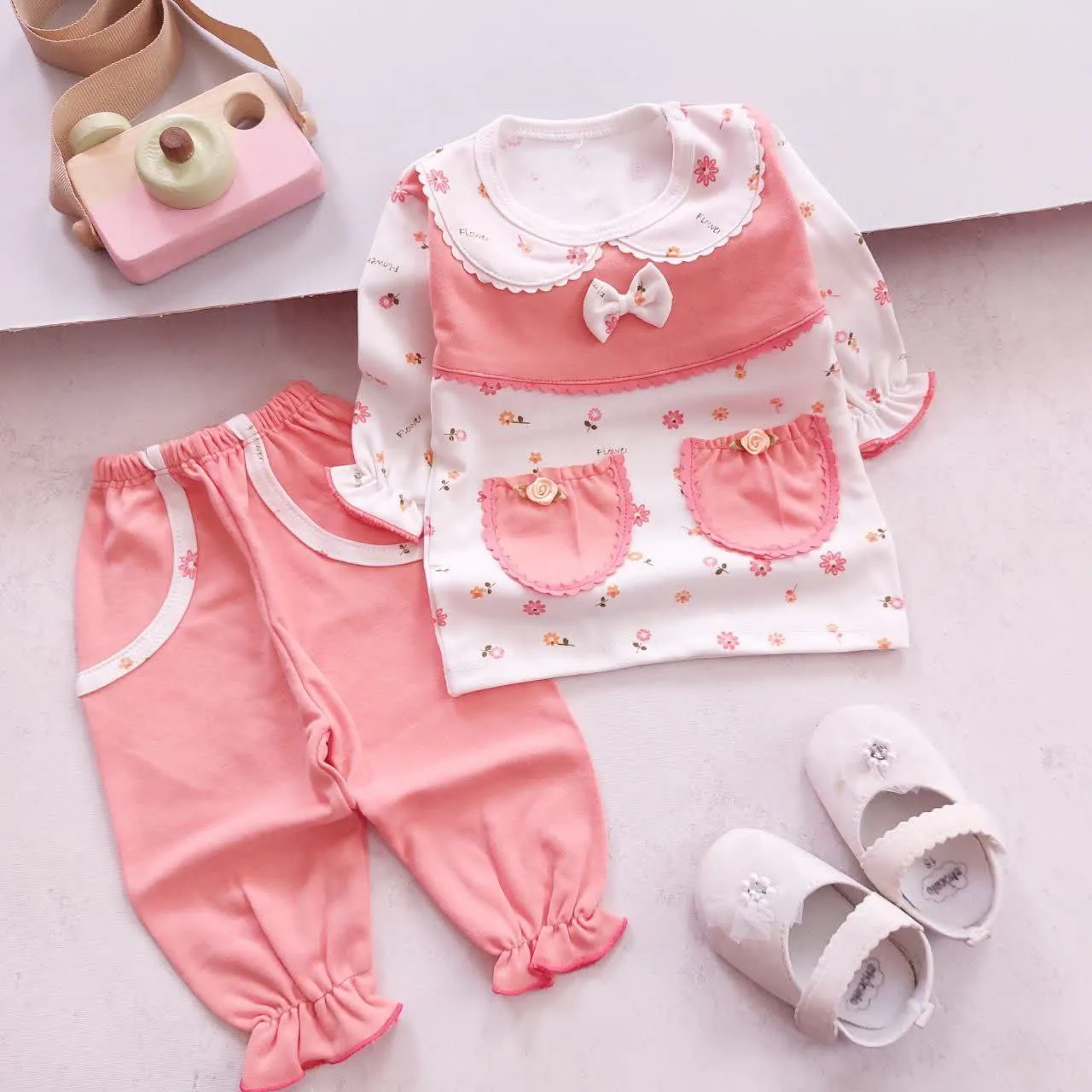 بلوز شلوار دخترانه گلبهی طرح دار نخی | مناسب 3 ماه تا 3 سال