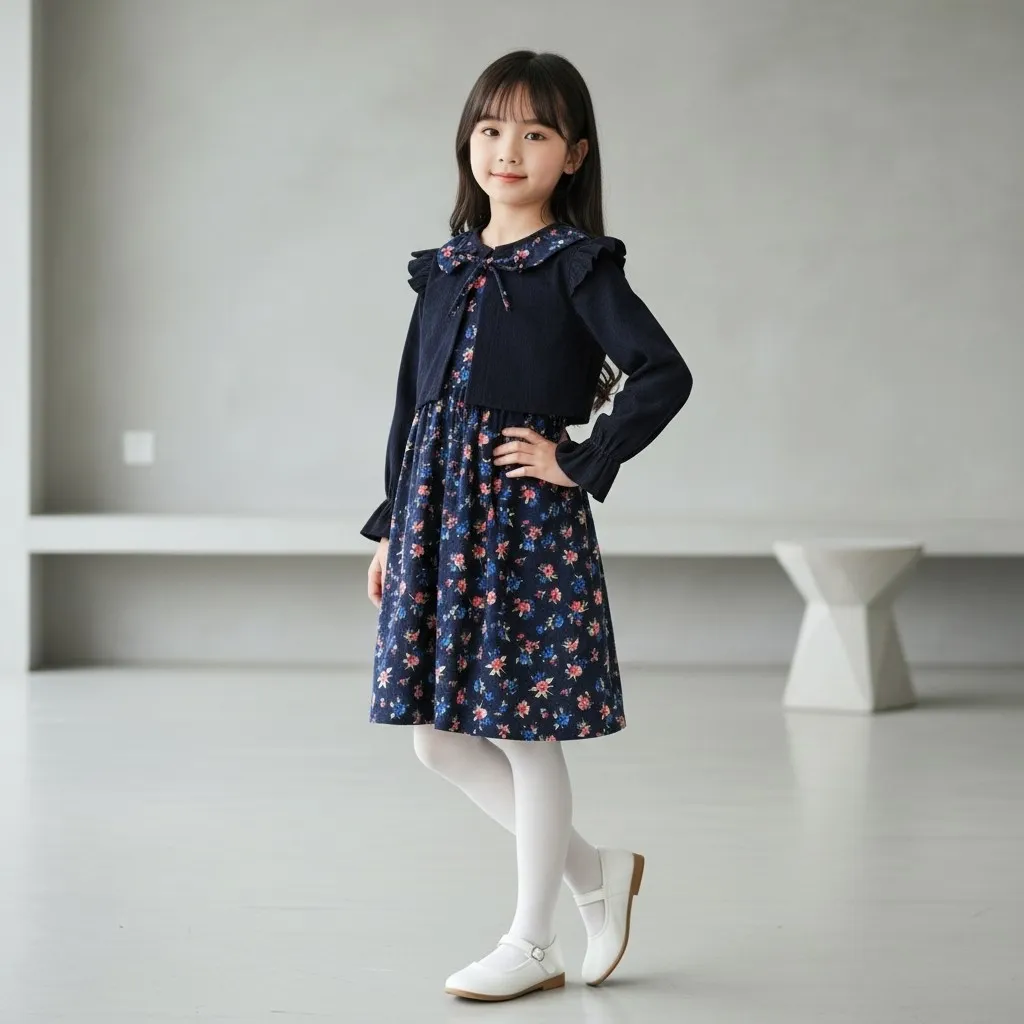 پیراهن دخترانه لینن پاییزه گلدار یقه کبریتی آستین پرنسسی مناسب 2 تا 9 سال
