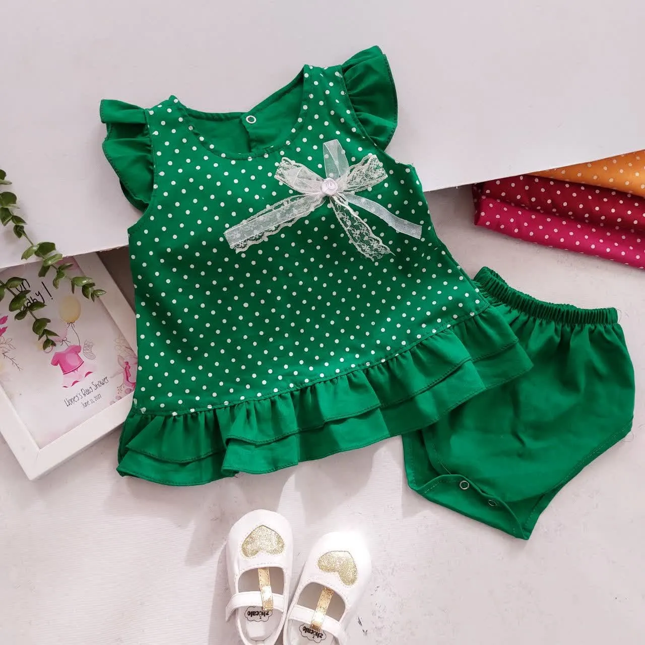 سارافون و شورت نوزادی دخترانه طرح خال خالی جنس کتان نخ درجه یک