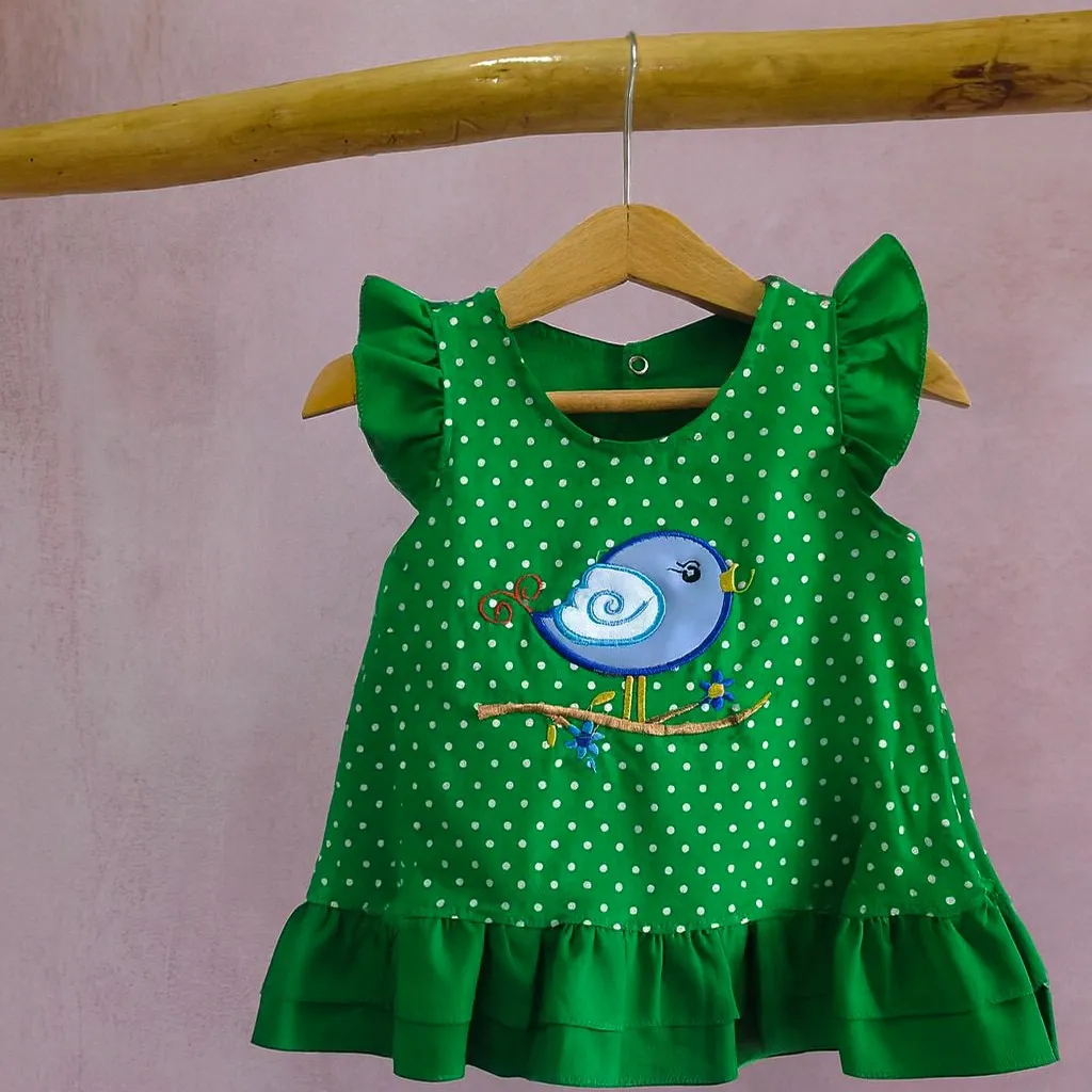 سارافون دخترانه طرح گنجشک خالدار نخی خنک مناسب 1 تا 3 سال