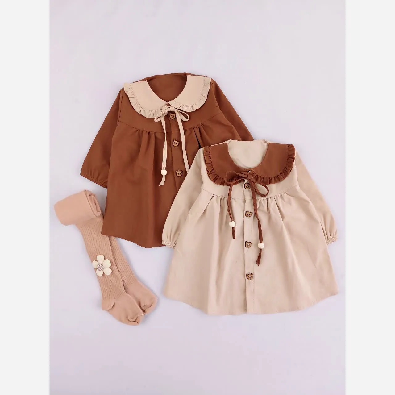 پیراهن کتان دخترانه یقه ب ببری آستین بلند مناسب 6 ماه تا 3 سال