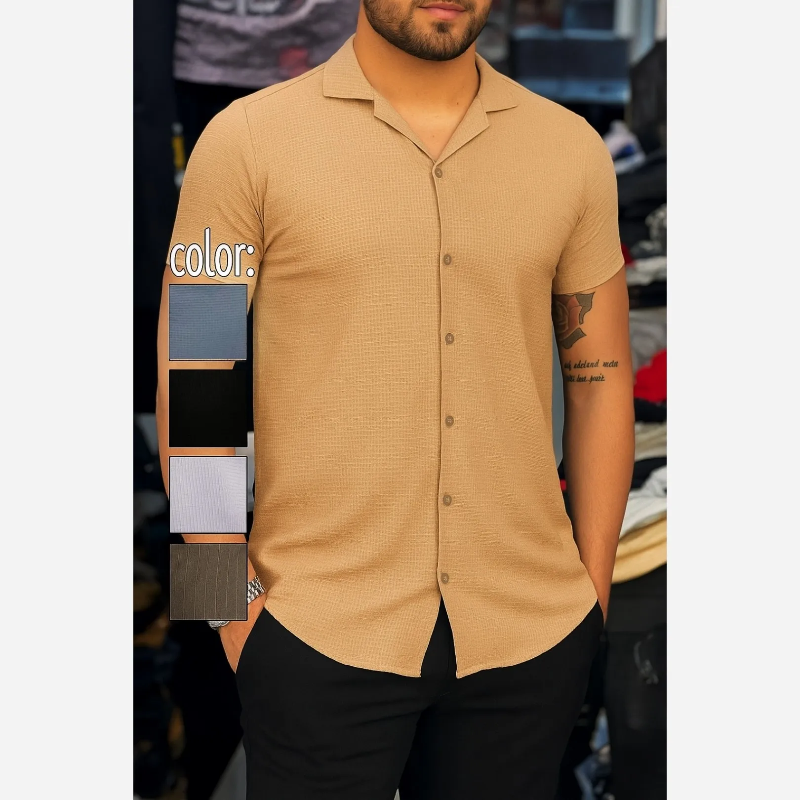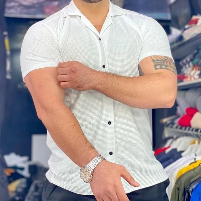 پیرآهن مردانه آستین کوتاه طرح بیسکویتی یقه شکاری مدل مراکشی