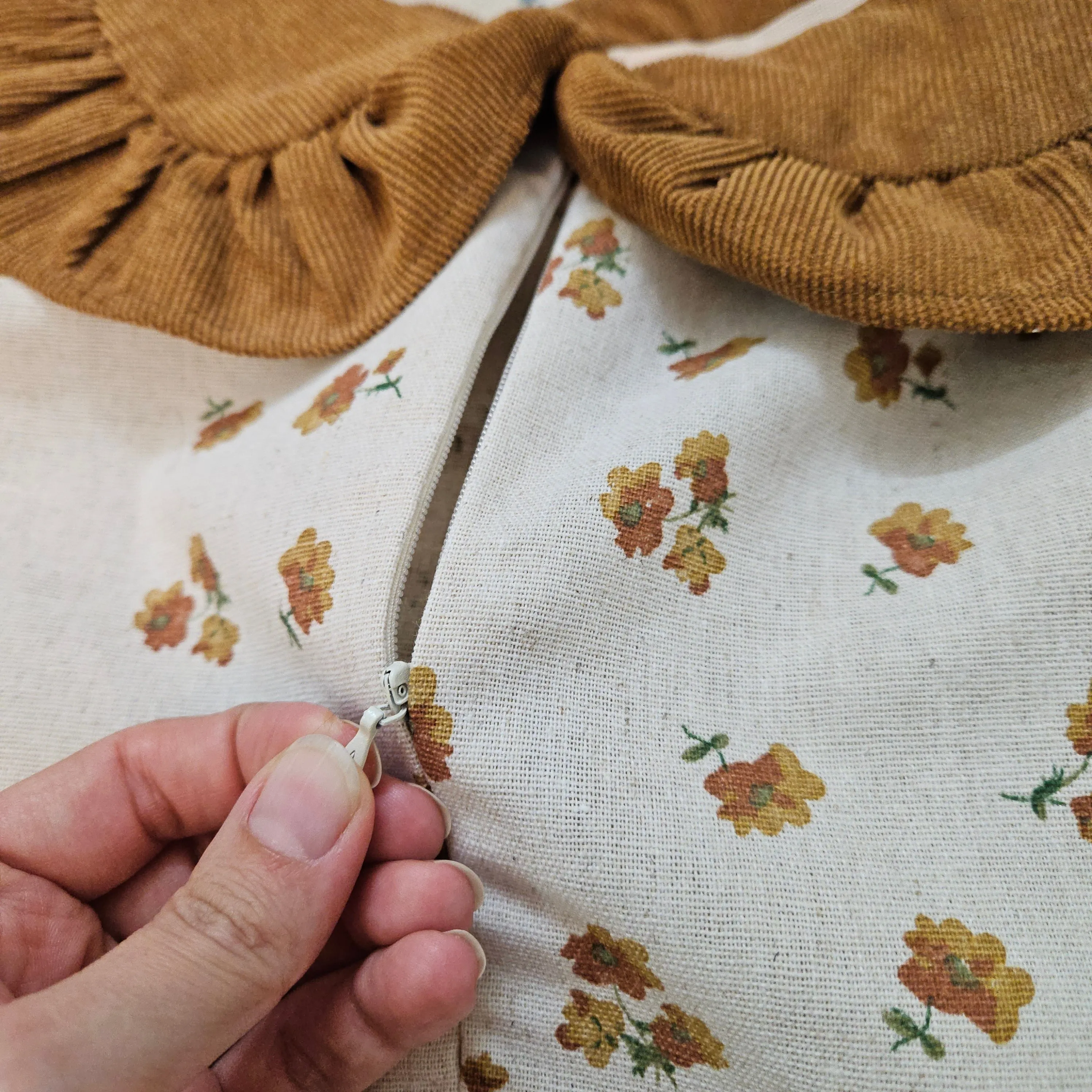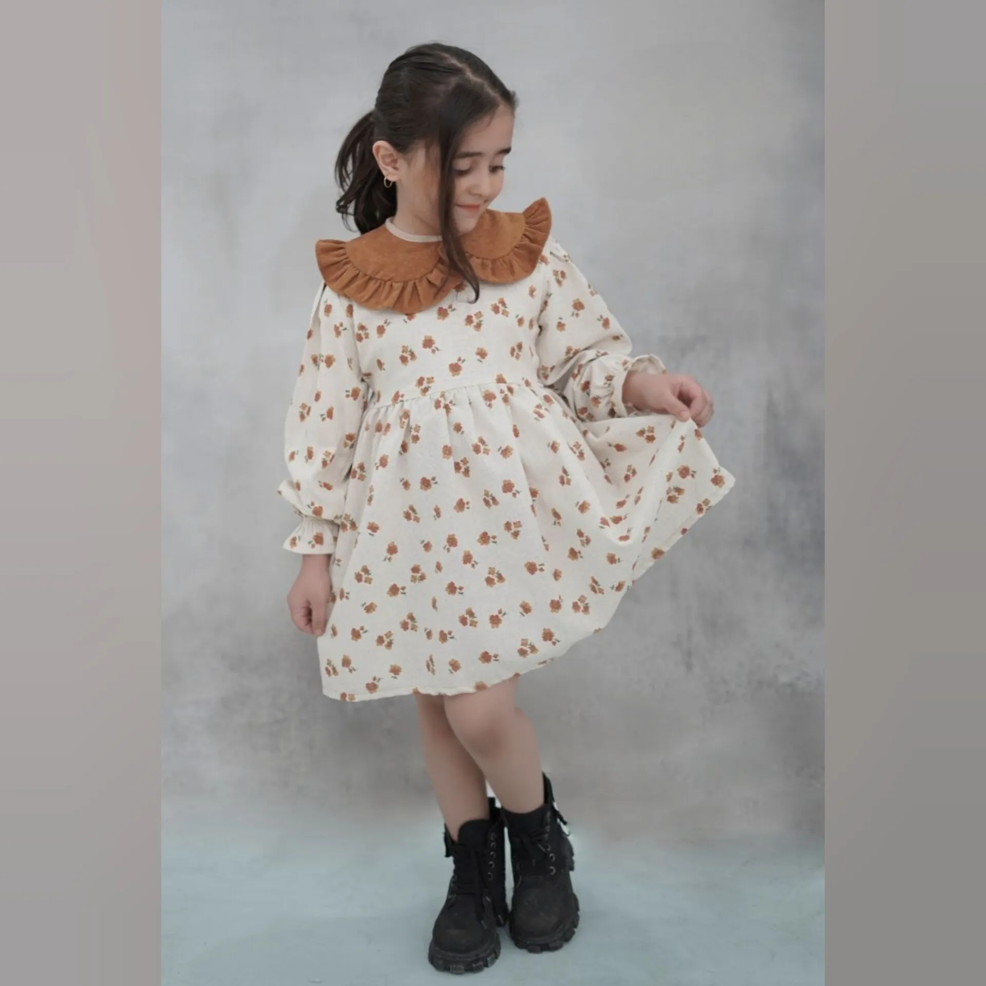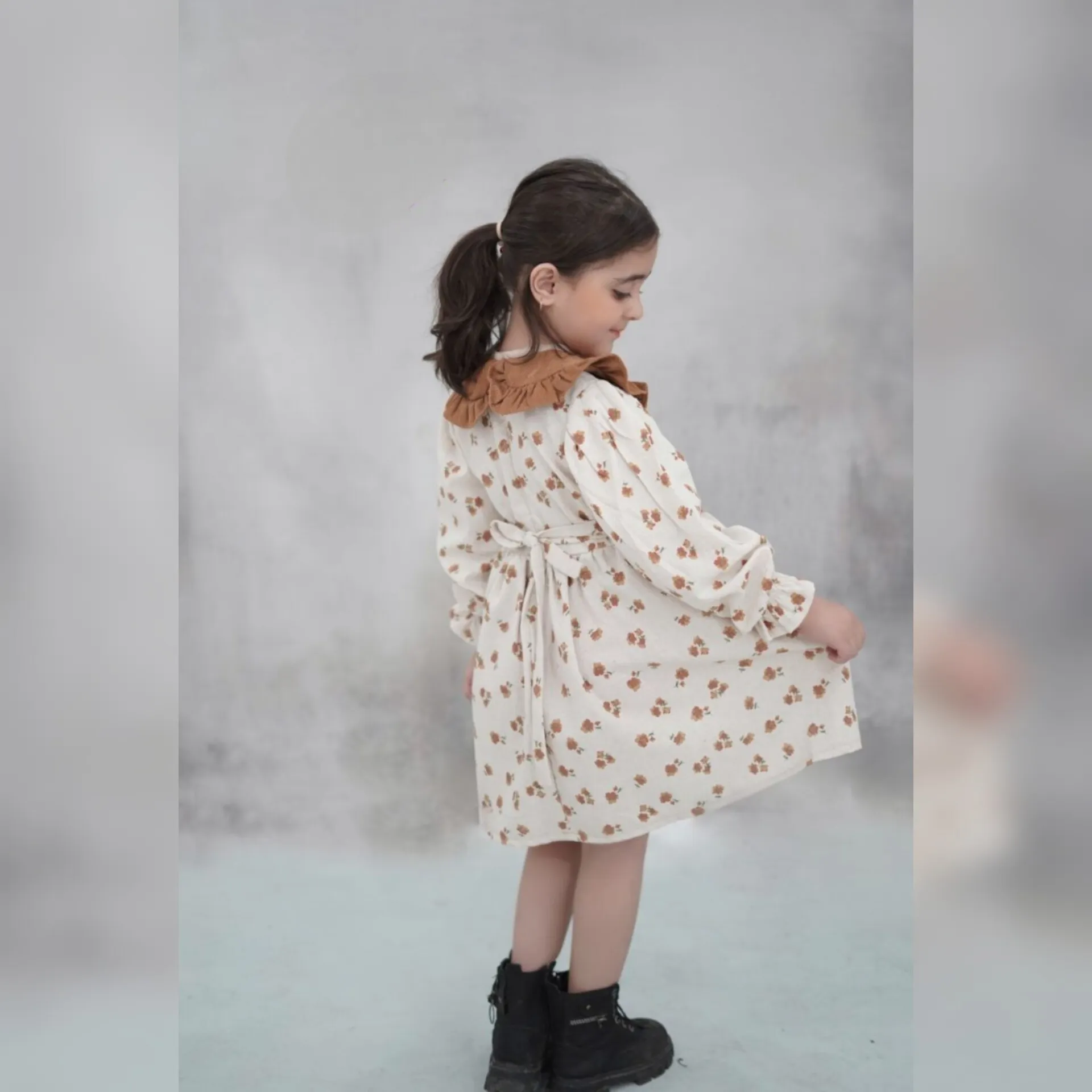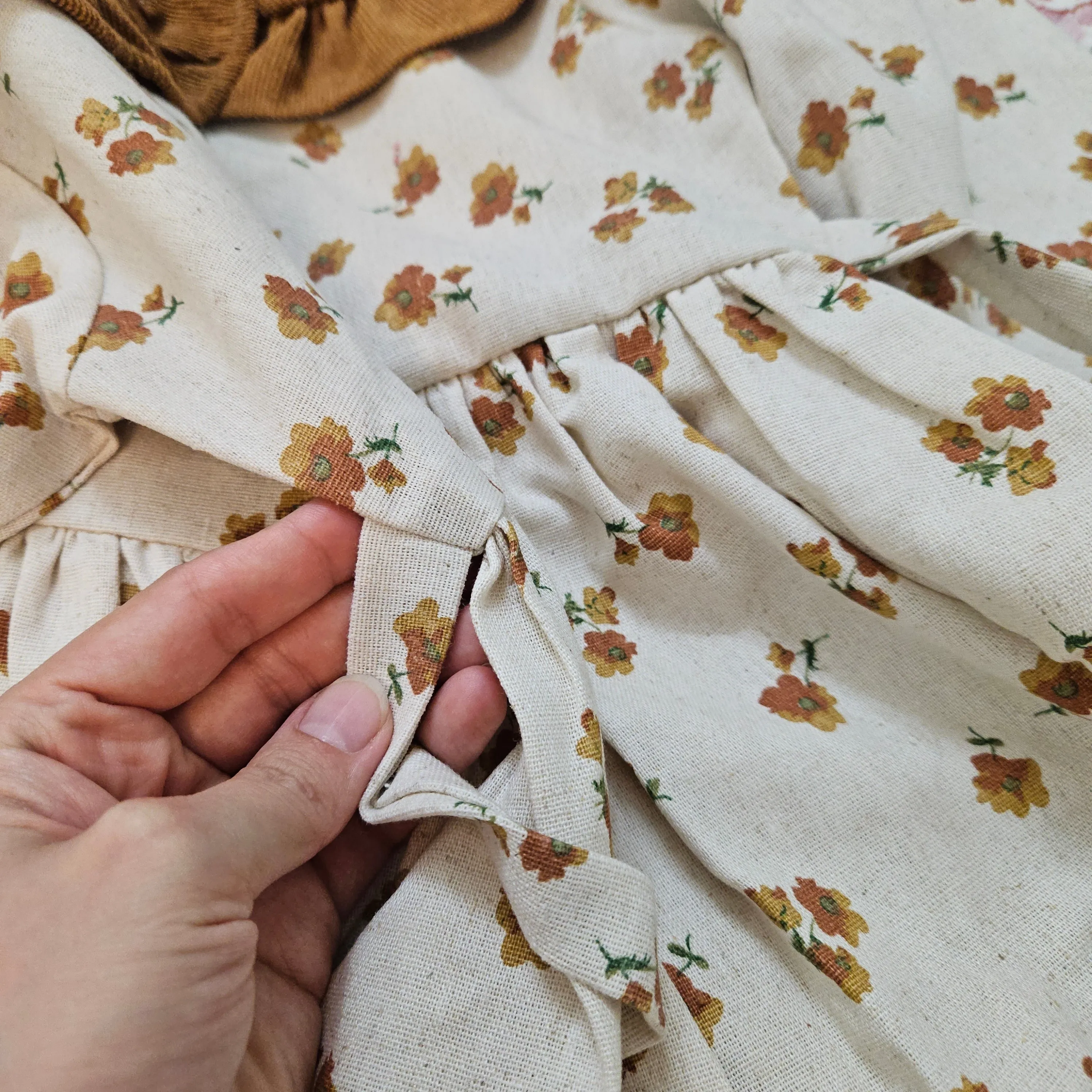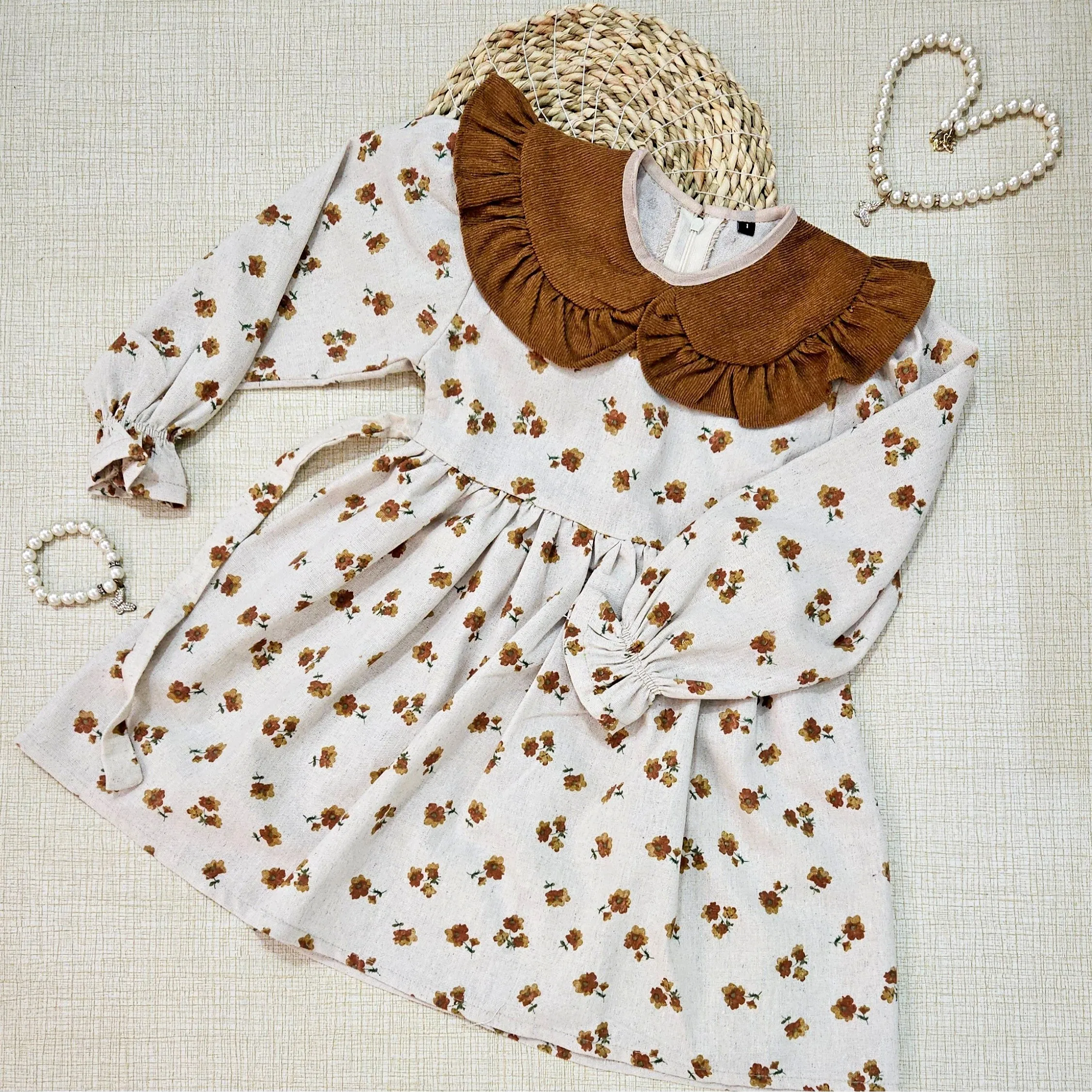 پیراهن دخترانه لینن پاییزه گلدار یقه کبریتی آستین پرنسسی مناسب 2 تا 9 سال