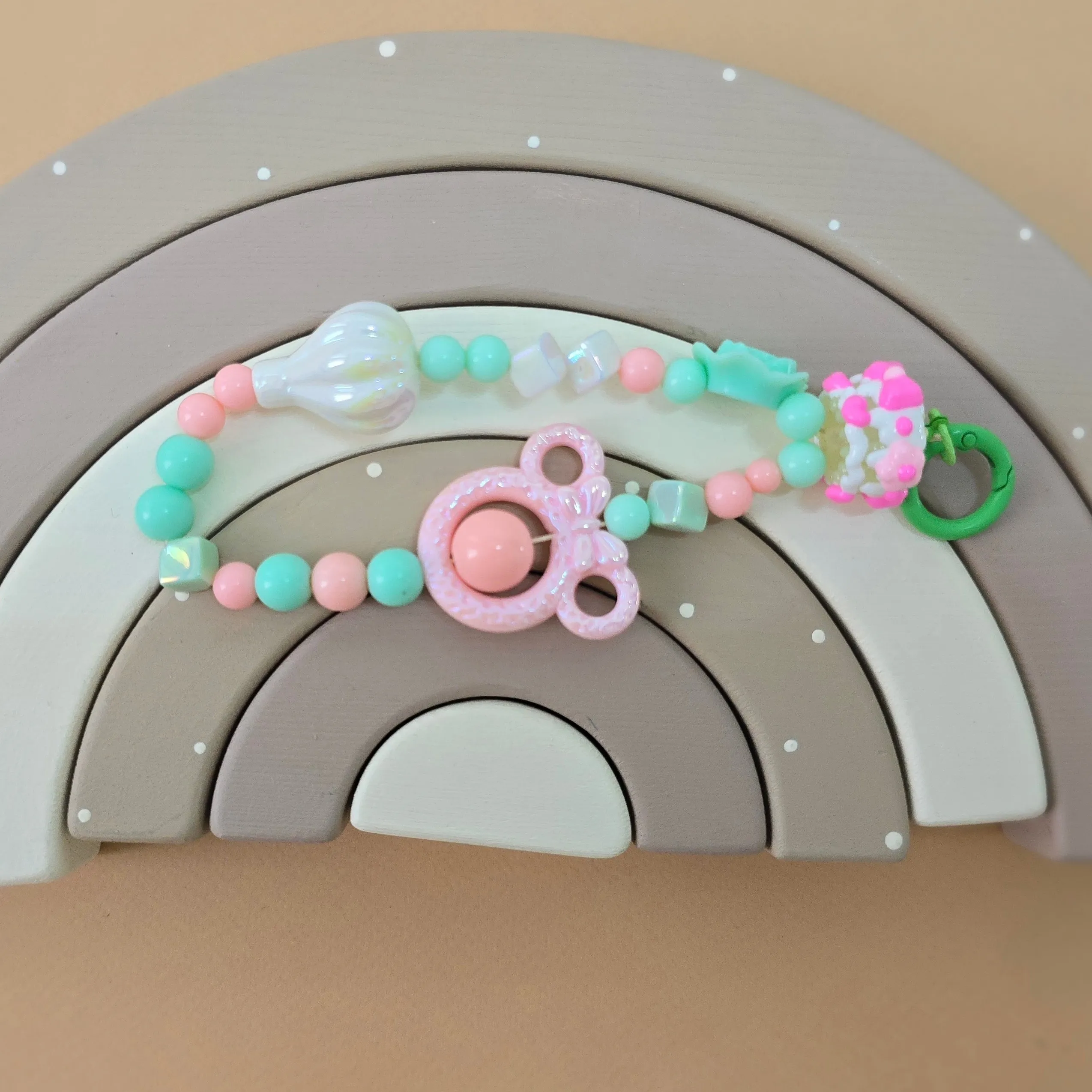 این آویز جغجغه و دندانگیر با طرح رنگین کمان، یک اکسسوری جذاب و کاربردی برای سیسمونی نوزادان دختر و پسر است. این محصول با هدف سرگرمی و تسکین لثههای نوزاد در دوران دندان درآوردن طراحی شده است.