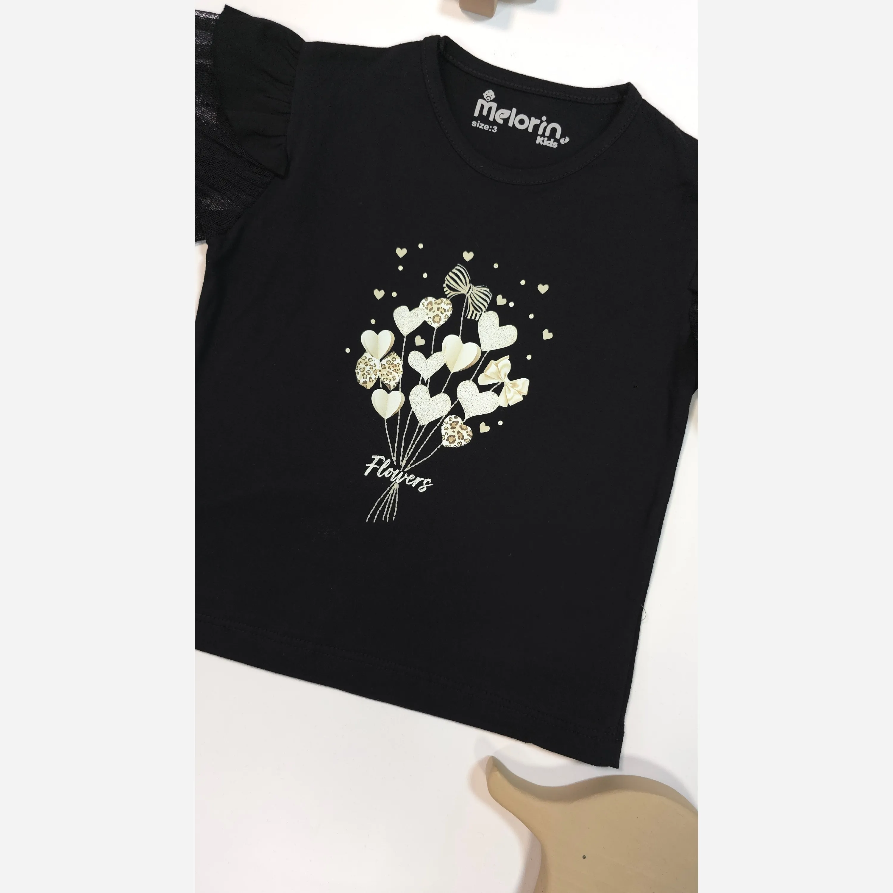تیشرت دخترانه طرح قلب و گل با آستین توری