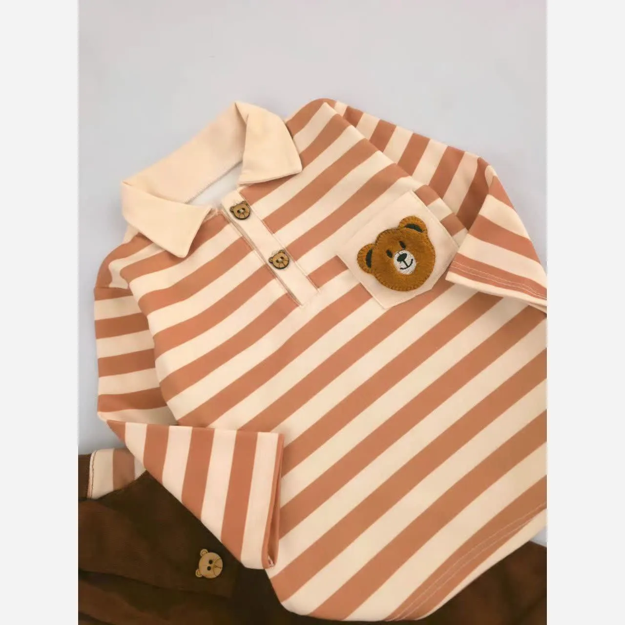 این ست بلوز شلوار راه راه با طرح جذاب خرس تدی، انتخابی ایدهآل برای دختران و پسران دلبند شماست. ترکیبی از راحتی و زیبایی که استایل روزمره کودک شما را تکمیل میکند.