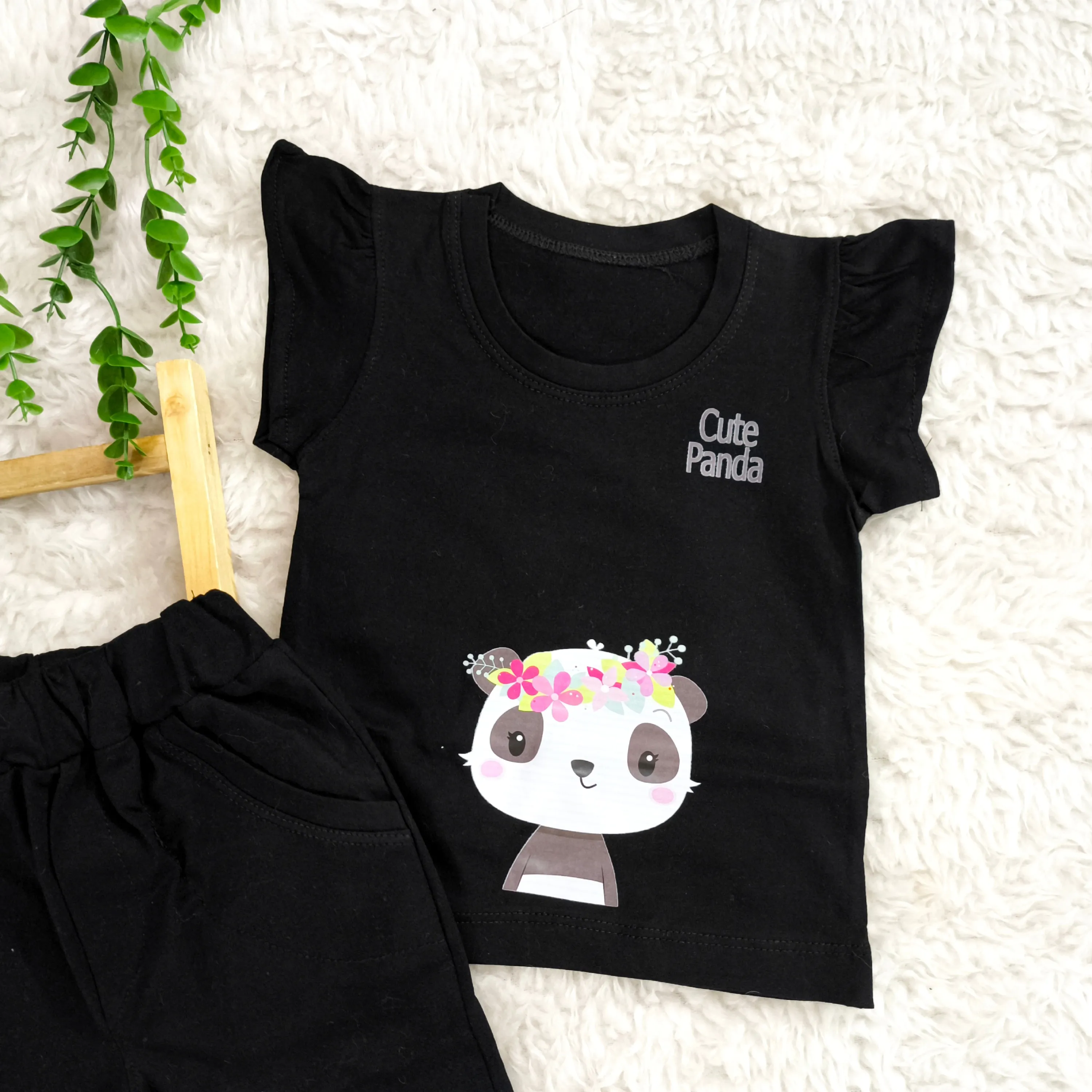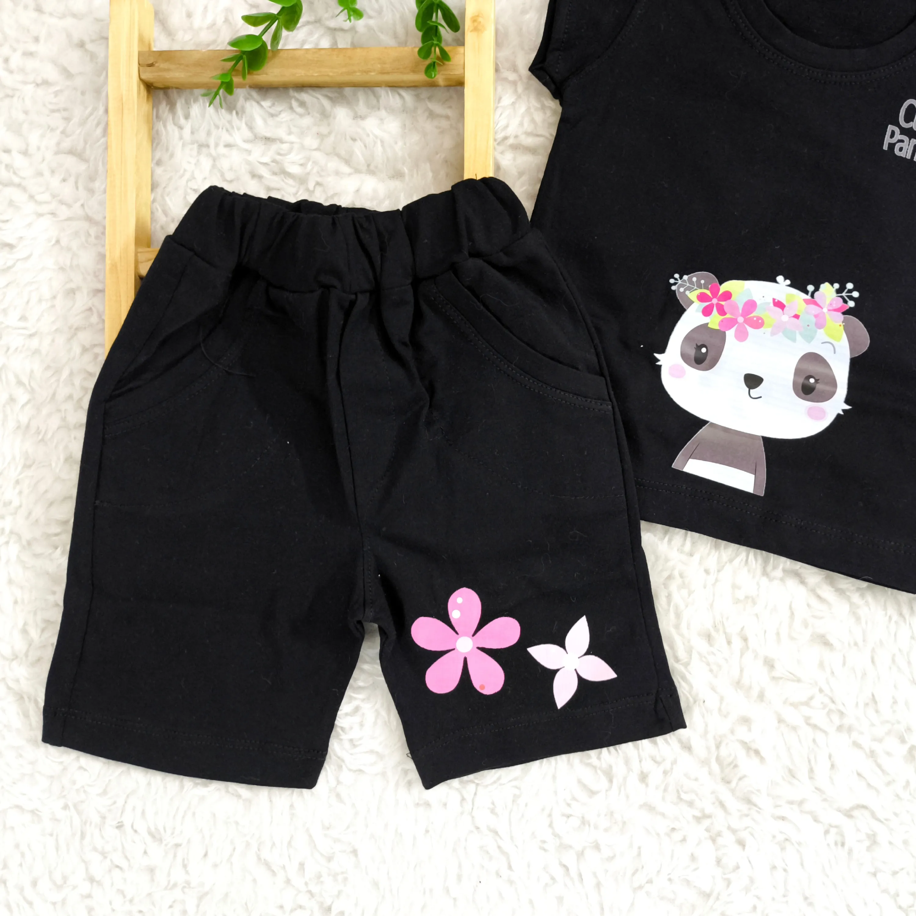 **تاپ شلوارک مشکی طرح پاندا دخترانه نخی خنک تابستانی (مناسب 1 تا 3 سال)**