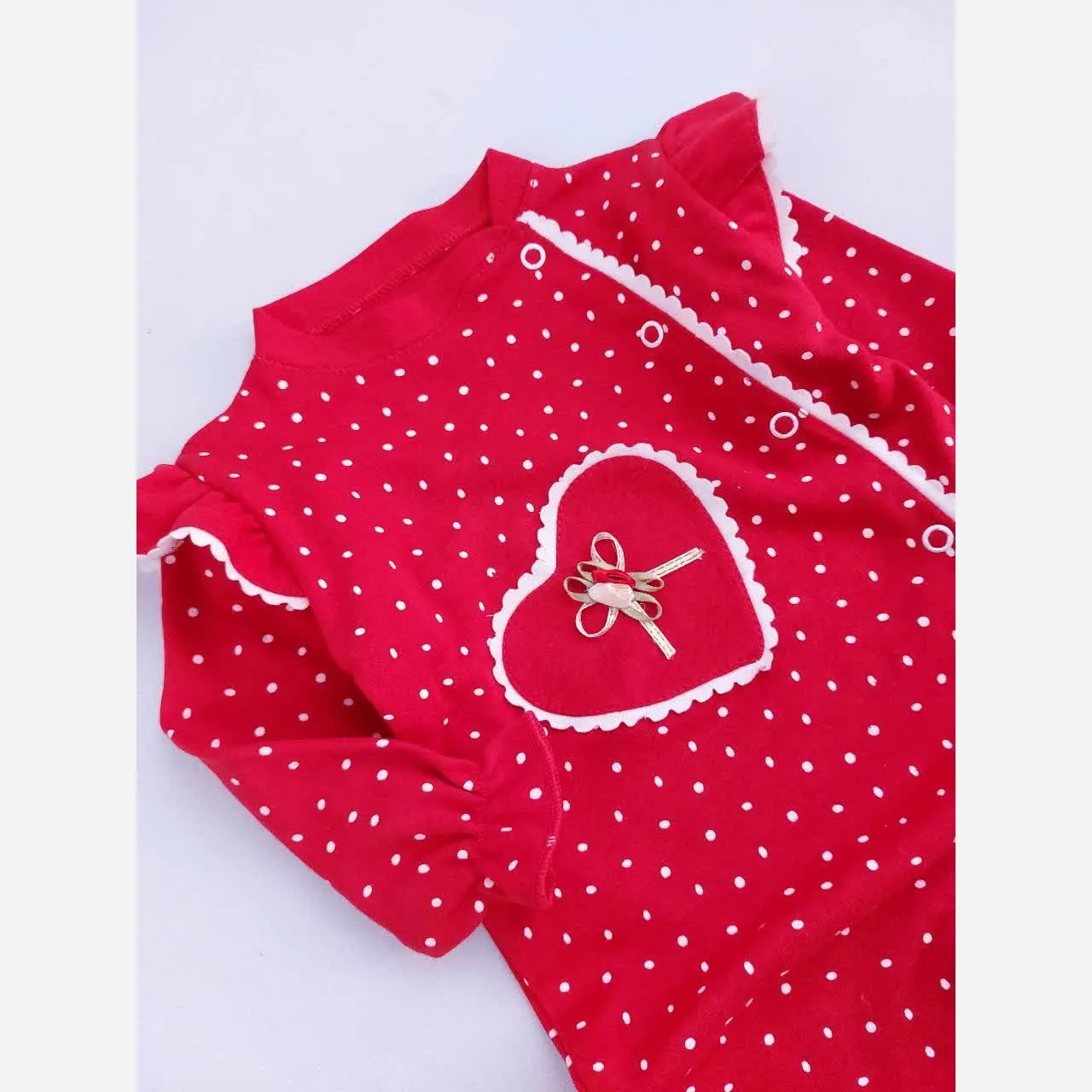 سرهمی نوزادی دخترانه قرمز خالدار طرح قلب | لباس یلدا 3 تا 24 ماه