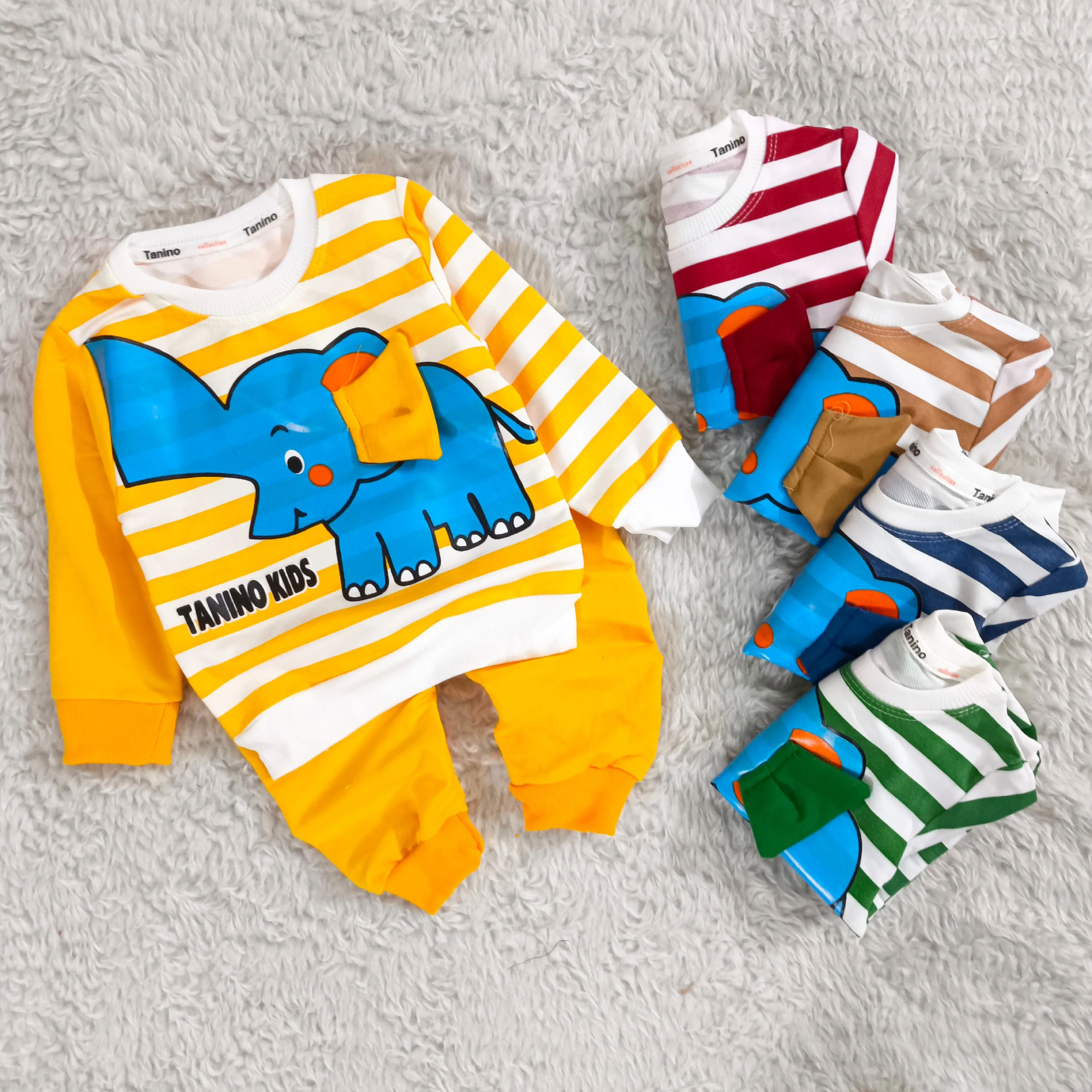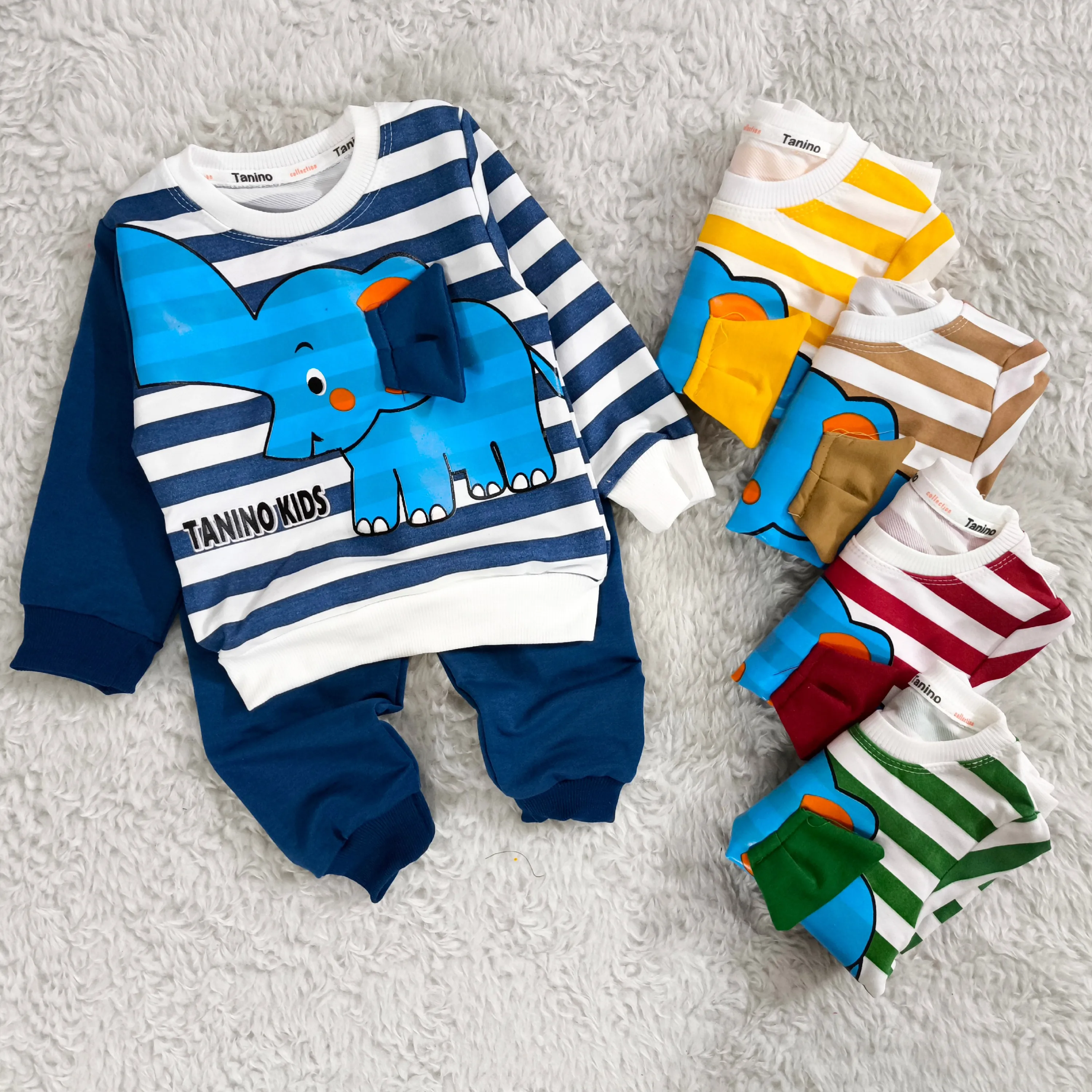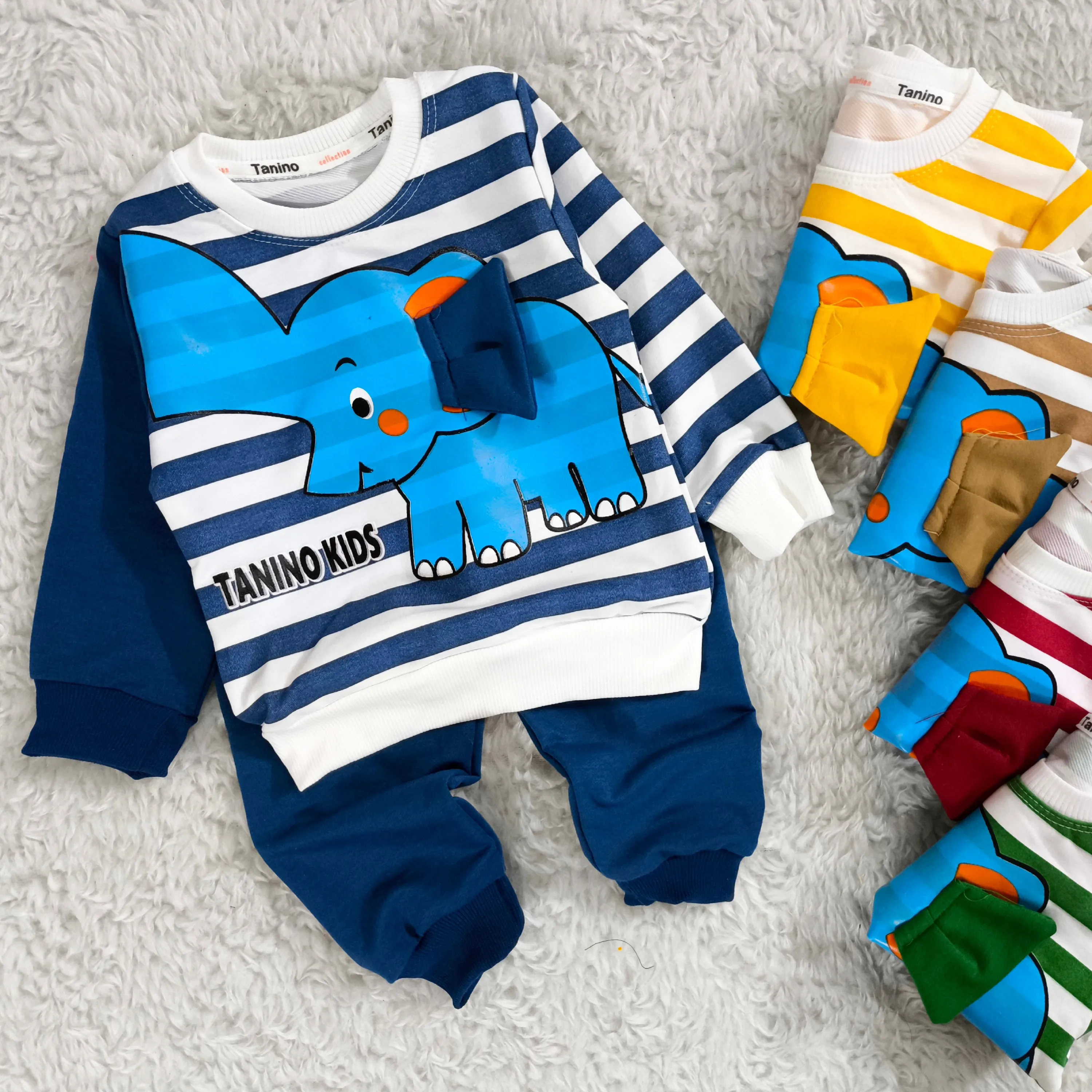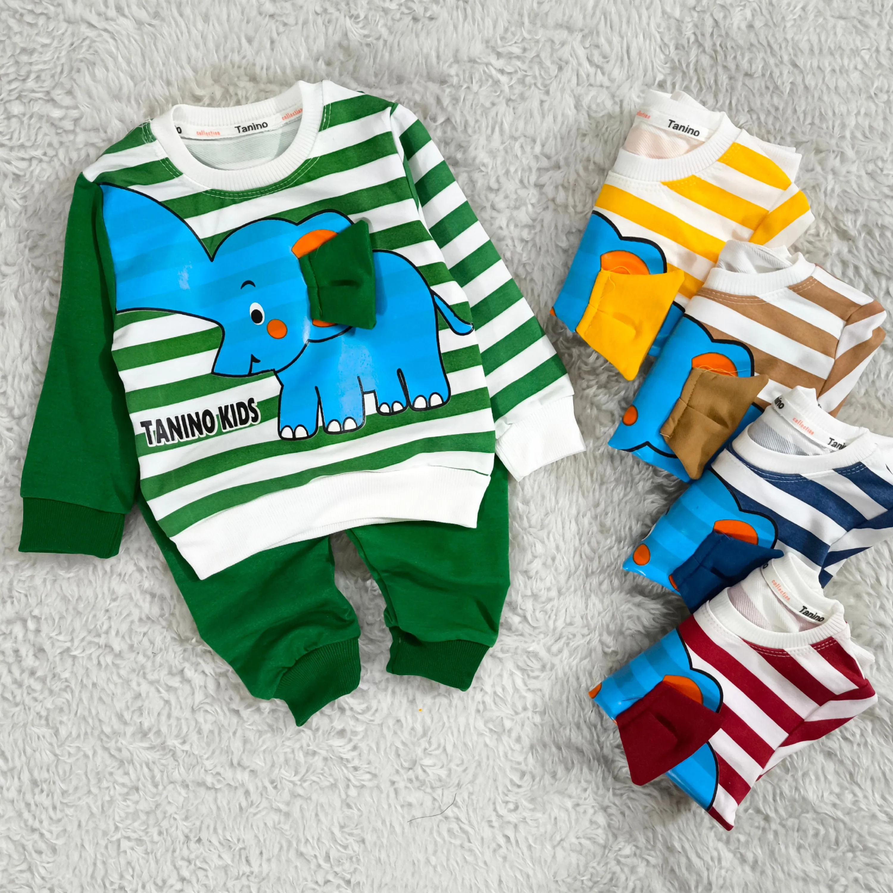 **بلوز شلوار پسرانه طرح فیل راه راه نخی پنبه دورس (مناسب 1 تا 4 سال)**