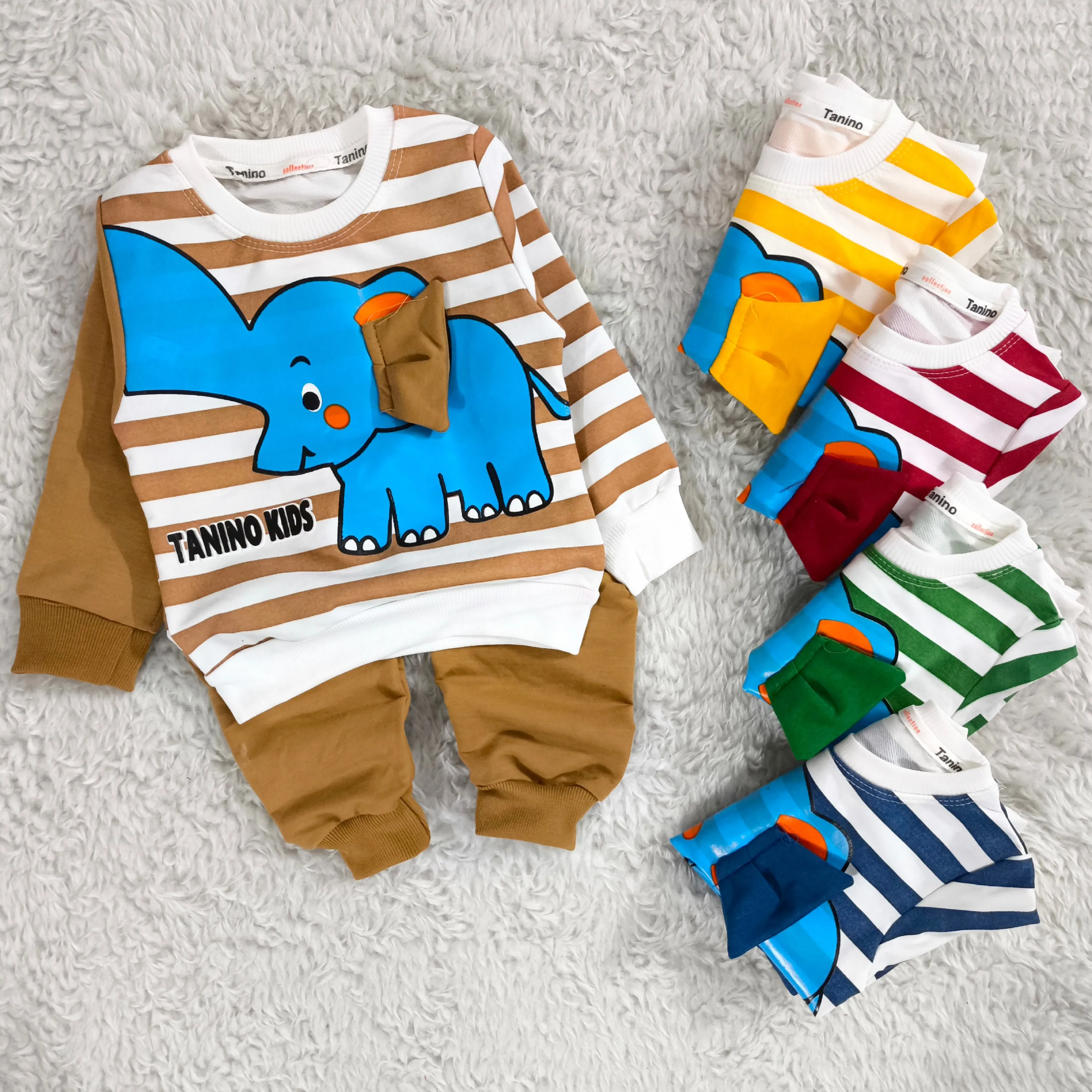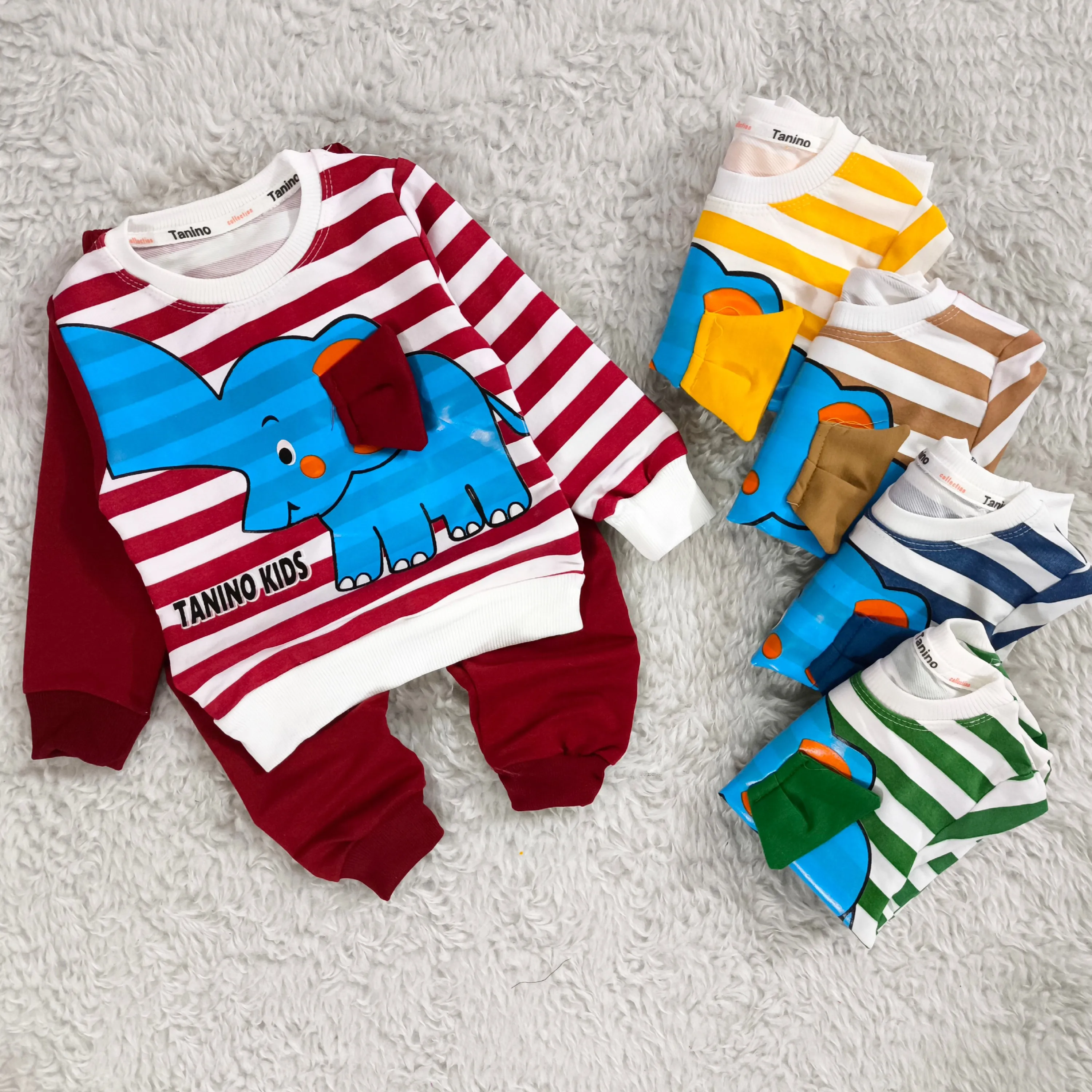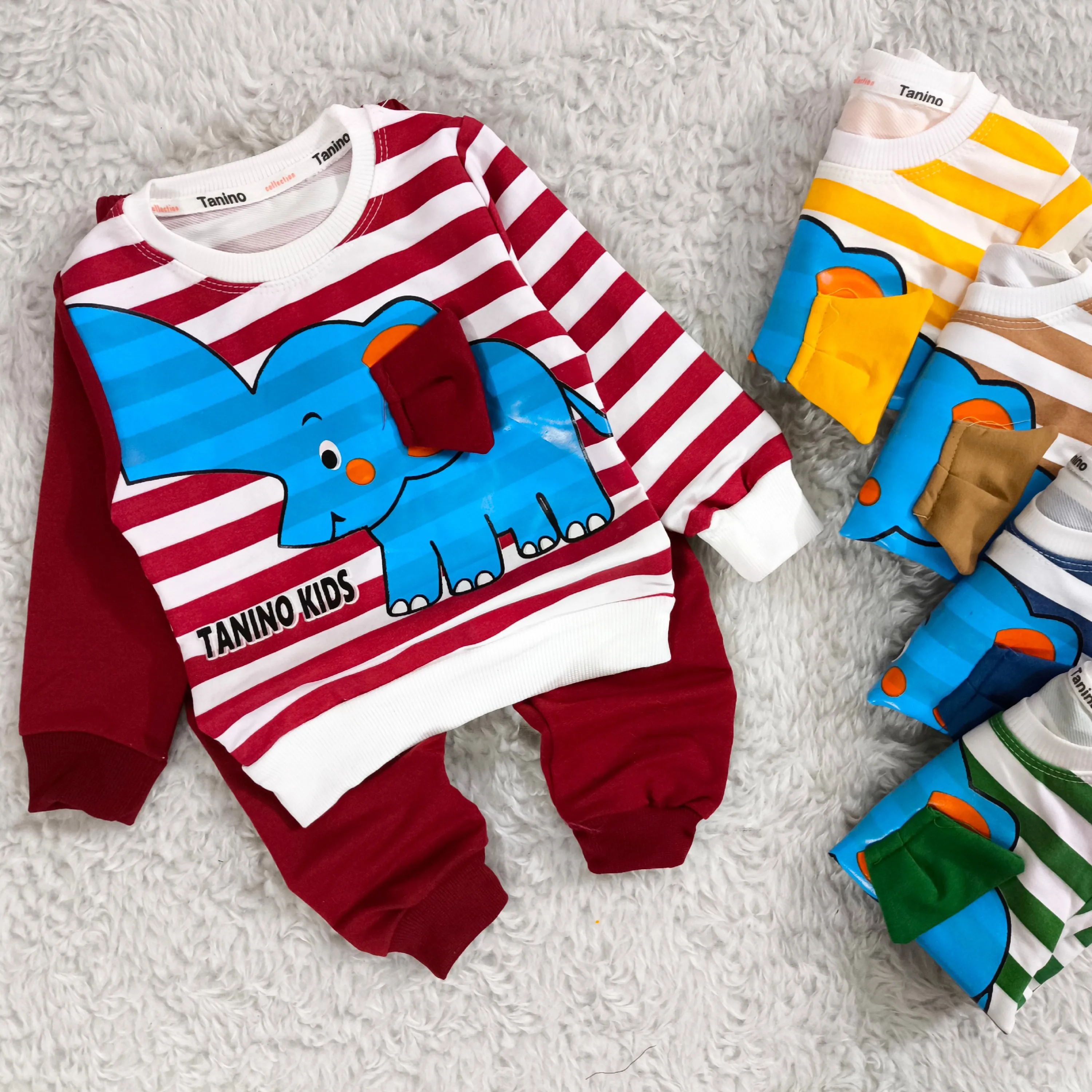 **بلوز شلوار پسرانه طرح فیل راه راه نخی پنبه دورس (مناسب 1 تا 4 سال)**