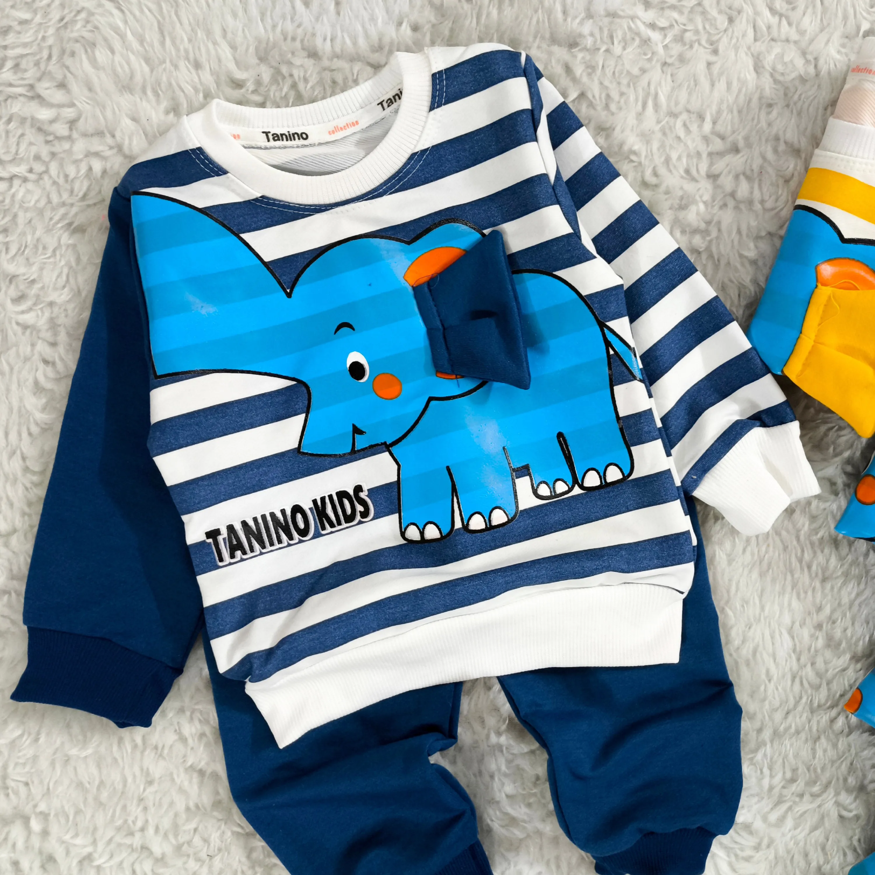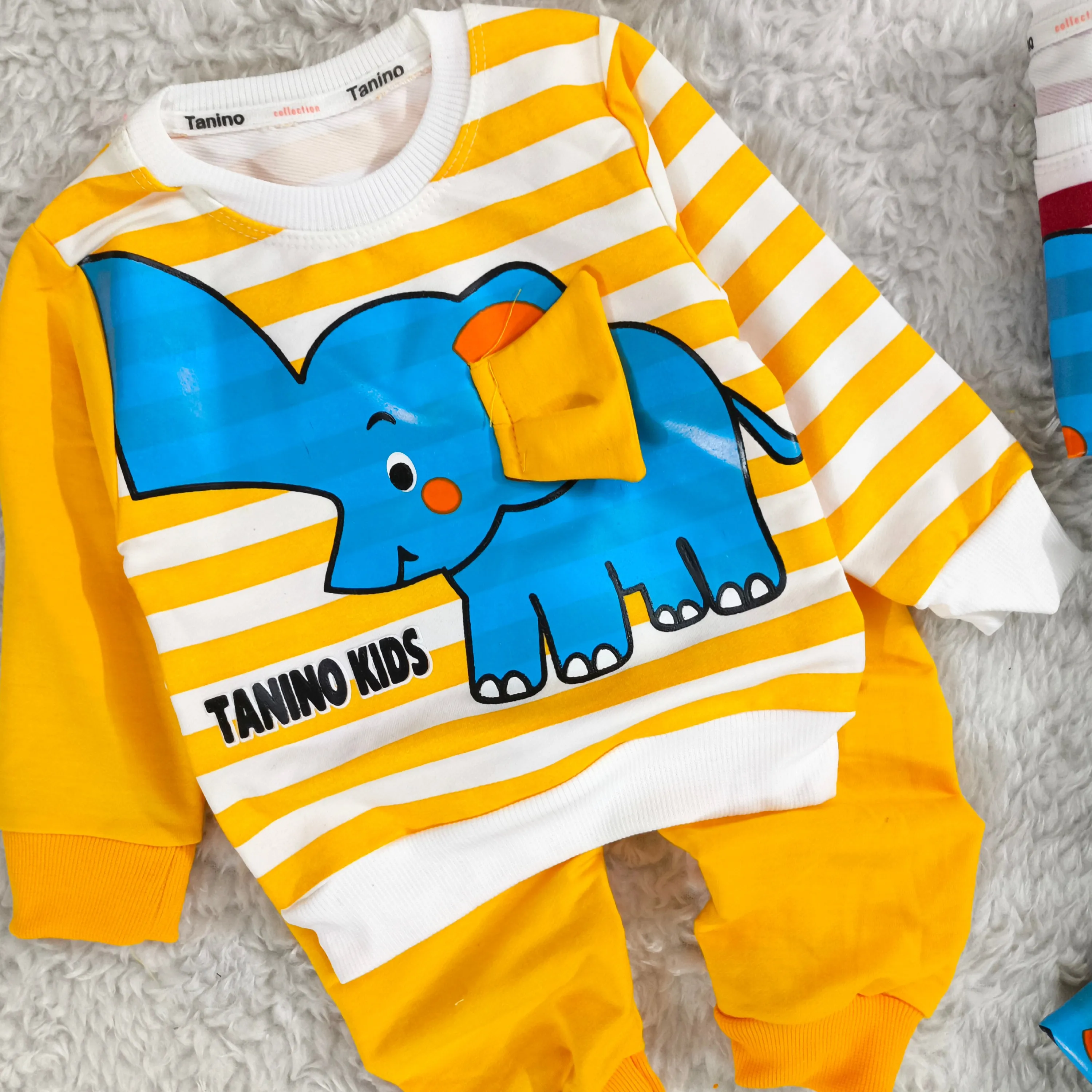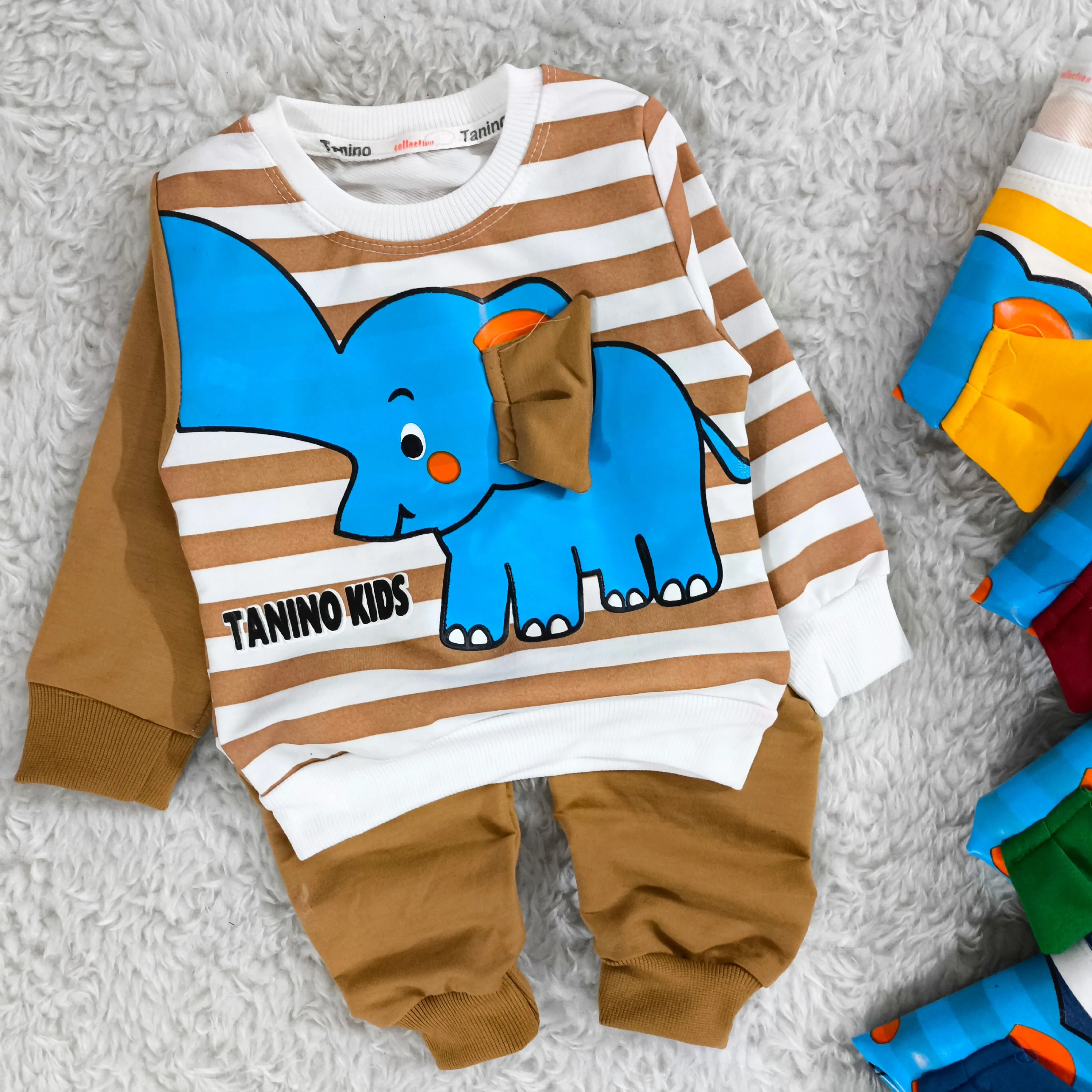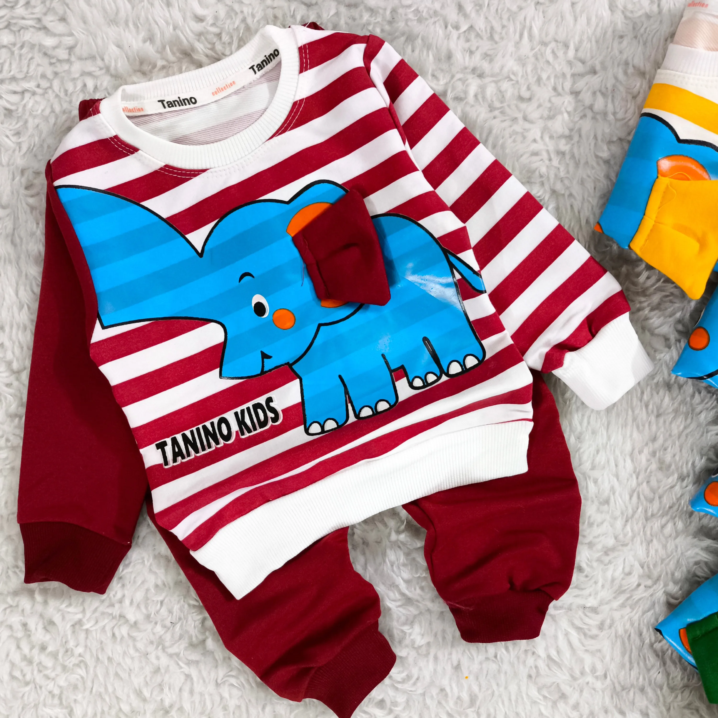 **بلوز شلوار پسرانه طرح فیل راه راه نخی پنبه دورس (مناسب 1 تا 4 سال)**